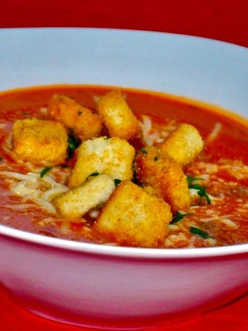Slow- simmered tomatoes blended with my house made chicken broth and Matignon vegetables. Served with crisp croutons and fresh parsley.